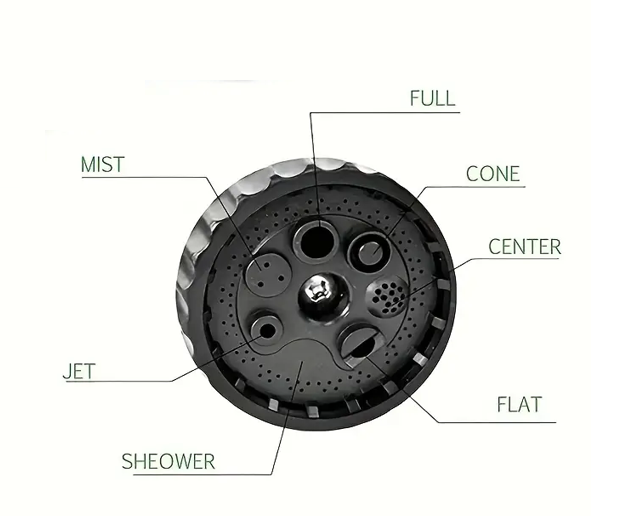 The SupaGarden Spray Gun Set includes a 1/2" or 3/4" threaded tap connector, female fitting, female water stop fitting and 6 pattern spray gun. The nozzle can be adjusted to give six spray patterns: flat, shower, jet, mist, soaker and cone.