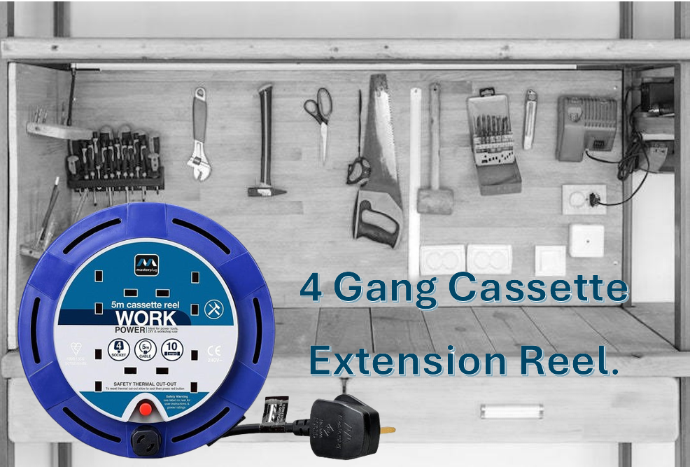 - STURDY, LIGHT AND PORTABLE CASSETTE EXTENSION CABLE REEL: From Masterplug, has four sockets for convenient use around the home and office