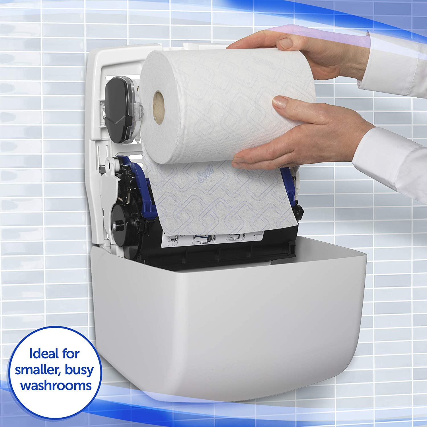This roll paper towel dispenser, with never-run-out 'stub roll' feature for a continuous rolled towel supply, is ideal for busy washrooms where consistency is key. The sleek and smooth rounded design of this towel roll dispenser has no dirt traps, allowing an easy one-wipe clean for improved washroom hygiene. This slim paper towel dispenser offers advanced protection against cross-contamination and is the most hygienic dispenser versus the competition. The paper towel roll dispenser delivers controlled single-sheet dispensing so users only touch the product they use, reducing contamination. Single-sheet dispensing also minimises waste, helping to cut unnecessary costs. Our touch-free dispensers reduce the risk of cross-contamination.