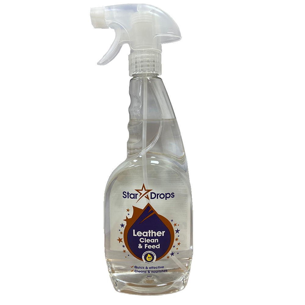 Stardrops Leather Cleaner & Feed 750ml The Stardrops Leather Cleaner is designed to penetrate dirt and grime for easy cleaning on leather surfaces such as sofas, chairs and cushions. Whilst it cleans dirt and stains from the material, the leather clean & feed also nourishes the leather, offering protection from cracking and prevents the leather from drying out.