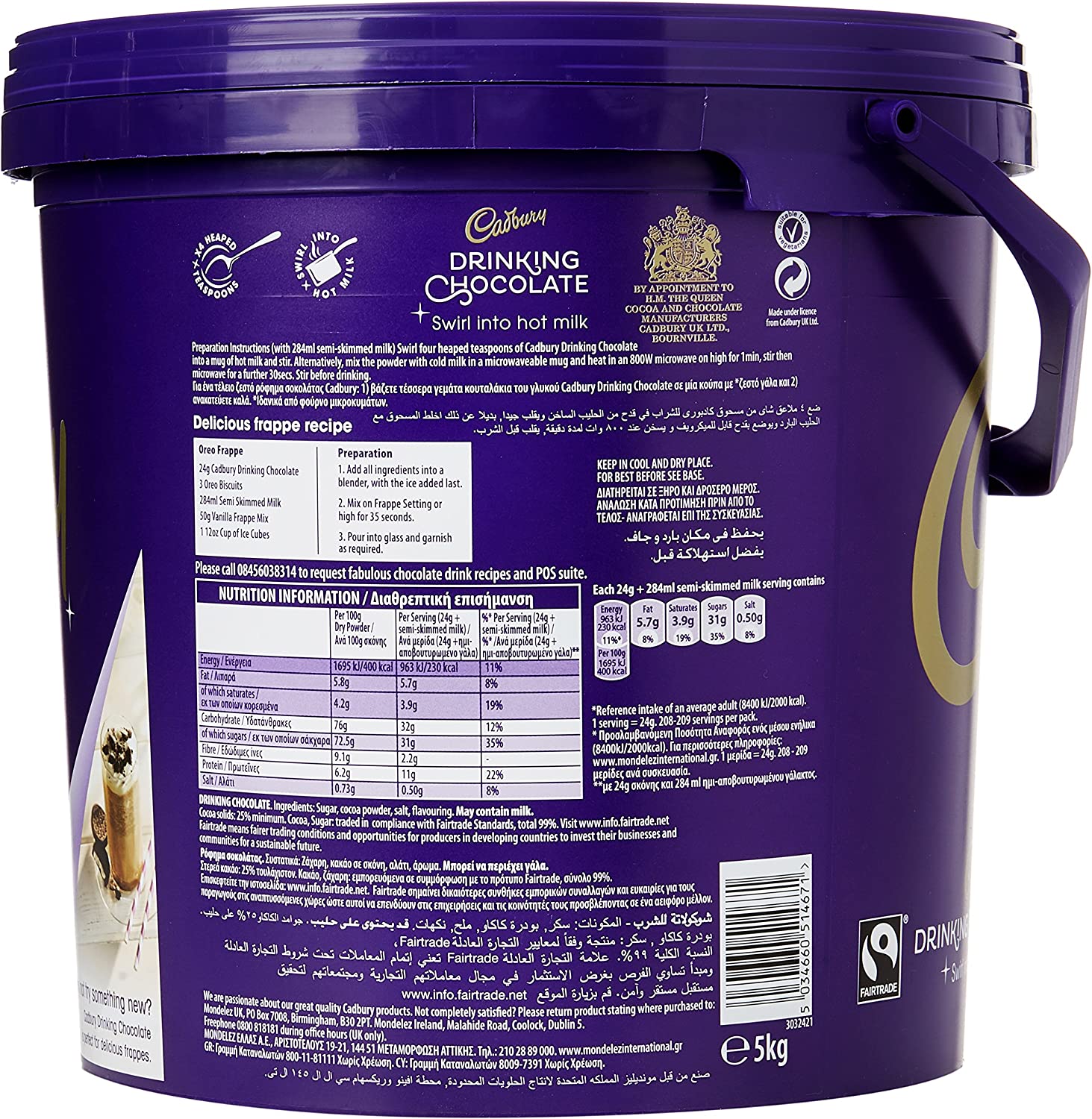 Cadbury Instant Drinking Chocolate 5kg Add Milk, Fairtrade.