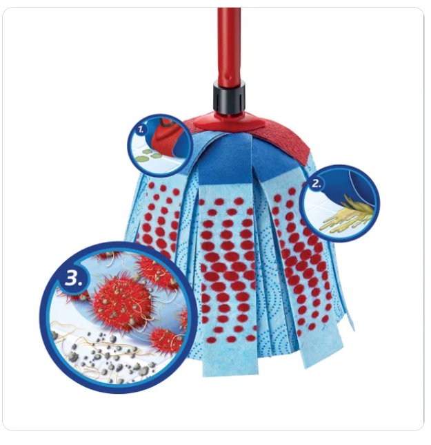 With the Vileda SuperMocio 3Action refill, you have the power of three mops in one product! The red non-scratch scrubbing zone removes even the most stubborn dirt, blue microfibre zones tackle greasy residue and the 3D red dots are ideal for extra hair and particle pick-up. The string mop refill uses advanced microfibre technology to remove over 99% of bacteria with just water* – no chemicals needed.