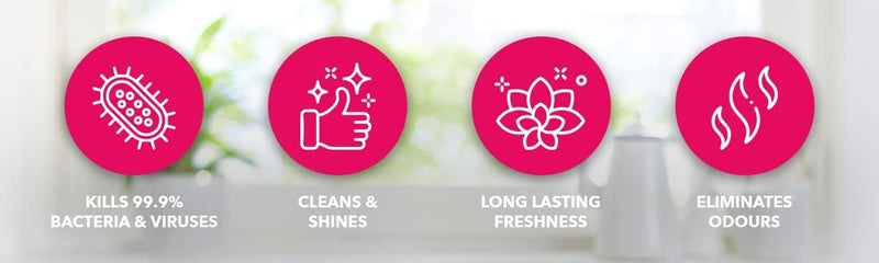 - All-purpose liquid: safe to use on most hard surfaces, including, worktops, tiles, baby equipment, children’s toys, furniture, door handles, toilets, potties, sinks, and as a floor cleaner, kitchen cleaner, bathroom cleaner, glass cleaner, blind cleaner, sink cleaner, and as a shower cleaner, saving heaps of time