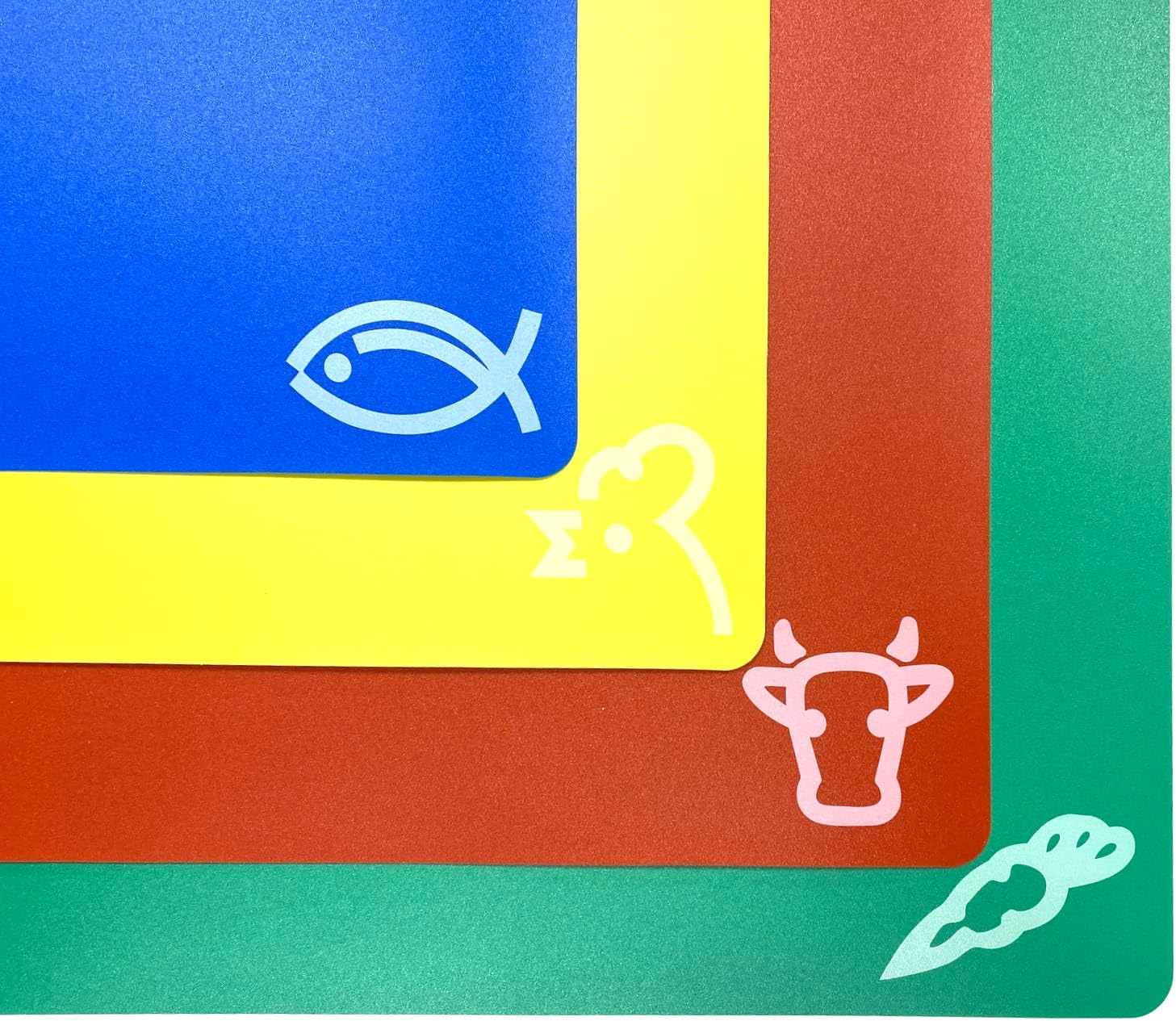 - Set of 4 handy flexible cutting mats, colour coded for food types: blue (fish), Red (meat), yellow (poultry), green (vegetables & salads), to help prevent cross contamination of foods whilst cooking