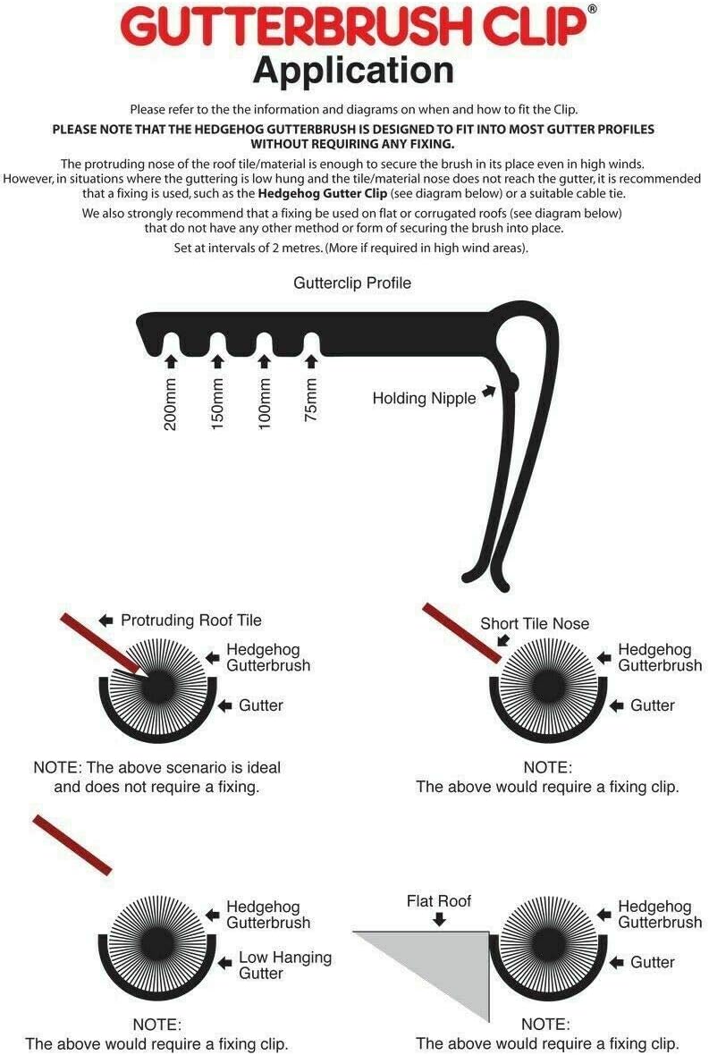 - DISCLAIMER - There is always a chance that the gutter brush will come loose and fall out during high winds, or when interfered with by birds. We would suggest 1 clip is used at ever 1m interval.