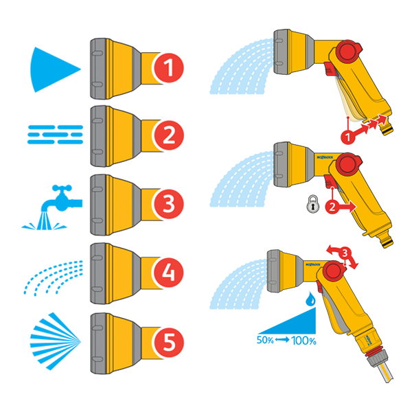 Five spray patterns – Cone for delicate watering, Powerful Jet for cleaning, Fast Fill for filling buckets and watering cans, Fine Rose for gently watering seedlings and Flat for rinsing soap suds off cars.