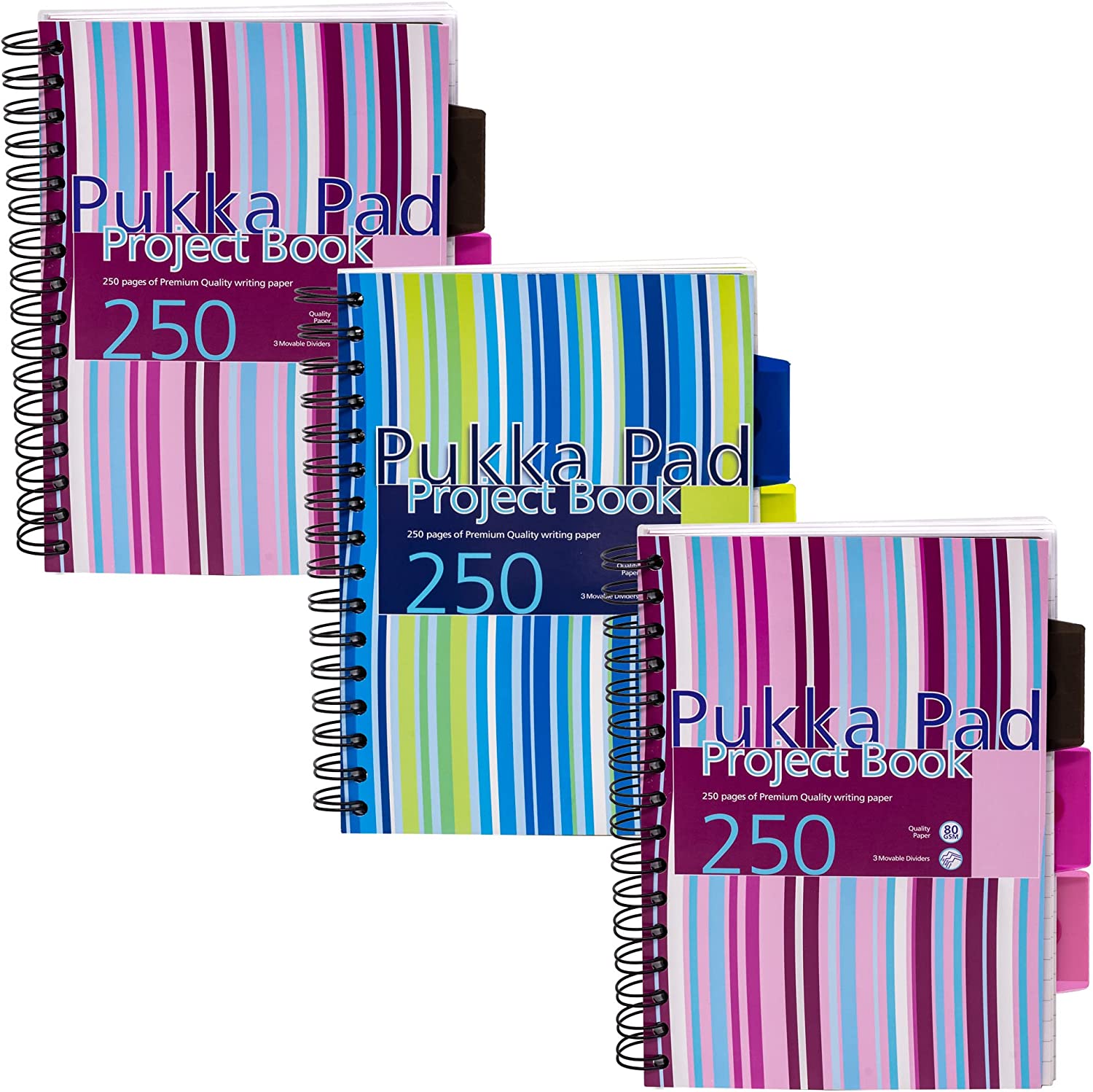 Pukka Pad, A5 Striped Project Notebook 3-Pack - 21 x 14.9cm - Wirebound Notebook with 8mm Feint Ruled Lines on 80GSM Paper – Includes 3 Repositionable Dividers with Storage Pockets - 250 Pages