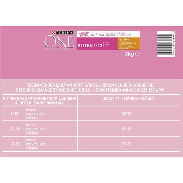 PURINA ONE Kitten is specifically designed to meet the nutritional needs of kittens (from weaning to 12 months) and pregnant or lactating cats.