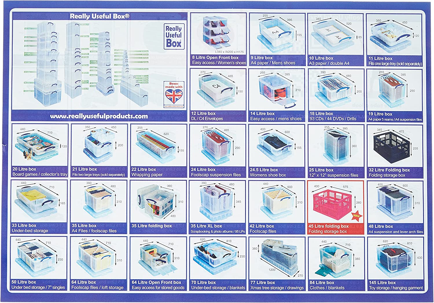 This Really Useful storage box is suitable for A4 suspension files for handy filing and storage in the office or at home. The box is made from durable polypropylene with a separate lid and integrated carry handles. Stackable and stable, this clear storage box has a 19 litre capacity and measures W375 x D255 x H290mm.