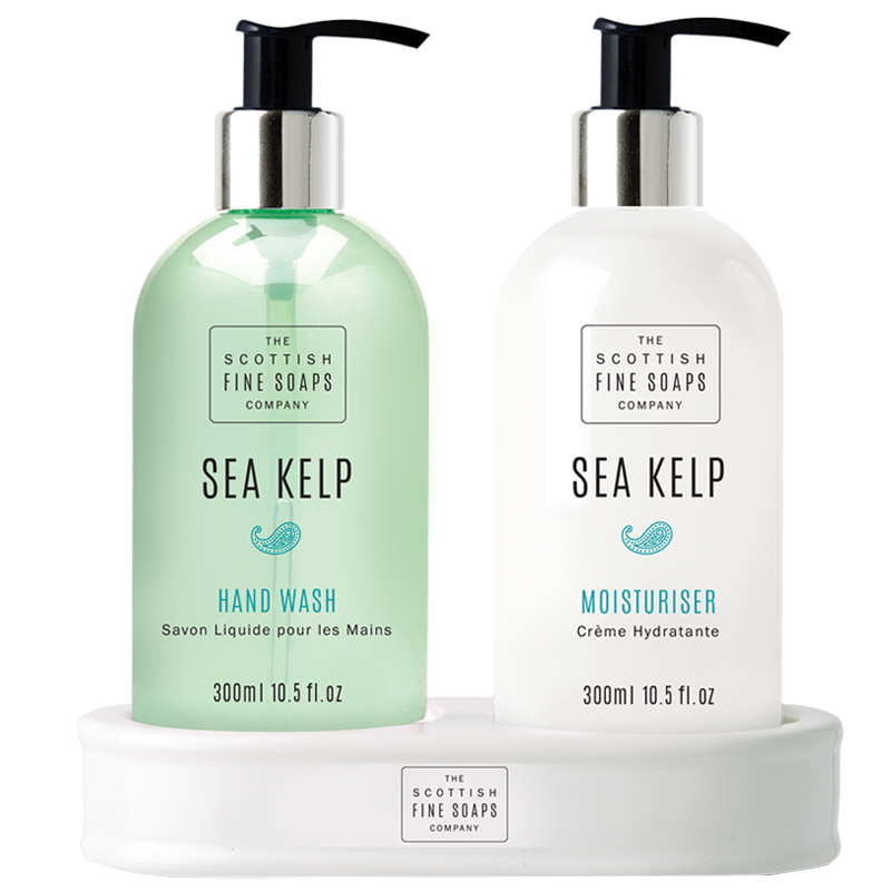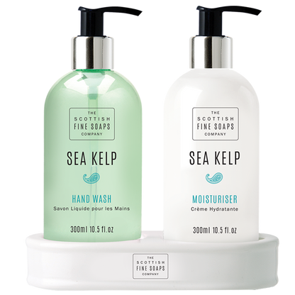 Scottish Fine Soaps Sea Kelp,Luxury 3pc Gift Set 1 x Moisturiser Cream 300ml, 1 x Hand Wash and 2pc Ceramic Bottle Holder