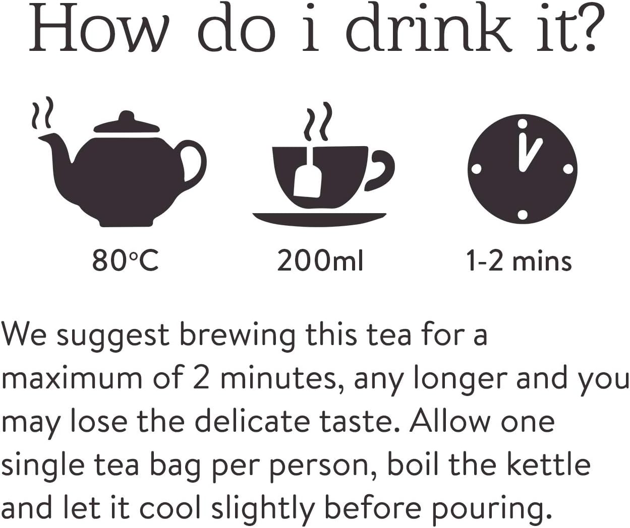 We suggest brewing this tea for a maximum of 2 minutes, any longer and you may lose the delicate taste. Allow one single tea bag per person, boil the kettle and let it cool slightly before pouring.