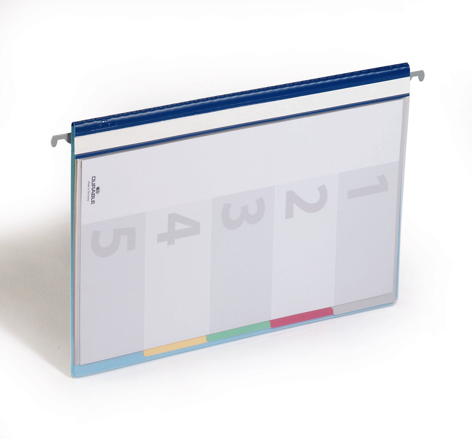 Five distinct folders in one for perfect organisation of your documents. Ideally suited as a project file, credit or insurance file. Transparent, A4 clear view pocket with blank Index sheet. Full-length label holder with blue PVC back cover. Five coloured sections, with tab and separate filing and mechanisms. Also includes a channel for A4 suspension rail.