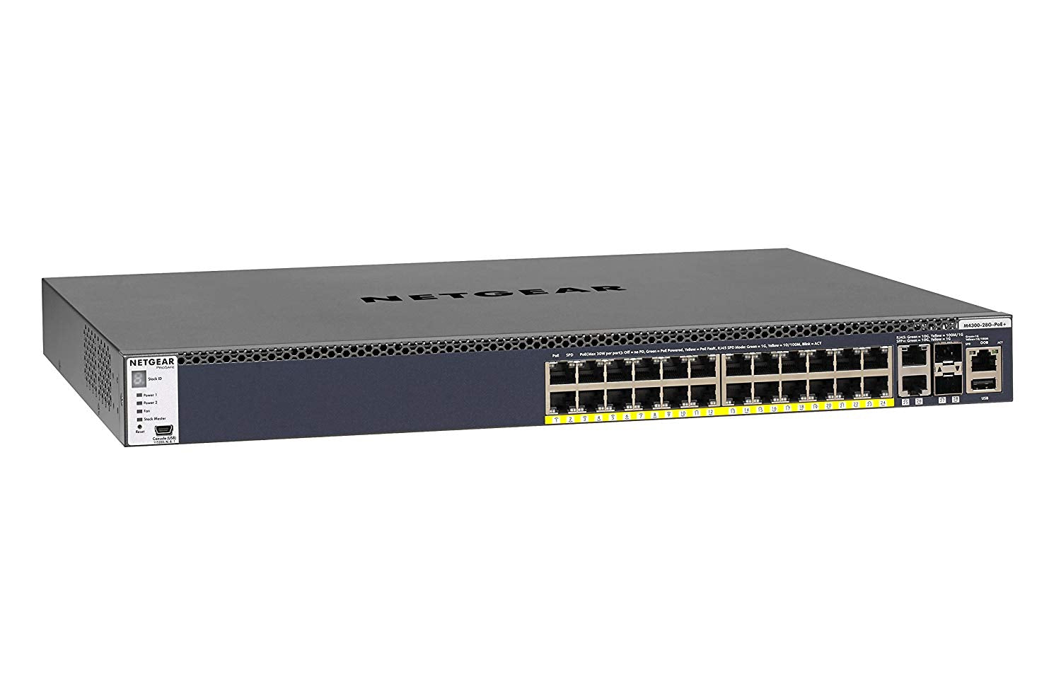 The NETGEAR® M4300 Stackable Switch Series delivers L2/L3/L4 and IPv4/IPv6 cost-effective services for mid-enterprise edge and SMB core deployments with unrivalled ease of use: 10/40 Gigabit models can seamlessly stack with 1 Gigabit models within the series, enabling spine and leaf line-rate topologies. Non-stop forwarding (NSF) virtual chassis architectures provide advanced High Availability (HA) with hitless failover across the stack. Intelligent IGMP+ multicast allows for scalable Pro AV installations at Layer 2 without the PIM complexity. Dual redundant, modular power supplies equipping full width models contribute to business continuity management. Layer 3 feature set includes static, dynamic and policy-based routing – as standard. The NETGEAR M4300 Switch Series is perfect for wireless access, unified communications and professional AV-over-IP installations.